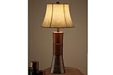 - Inspired by an artistic endeavor, this table lamp features a tan bell shaped shade topping a multi-textured base starting with a hammered metal, rope center and smooth upper base.